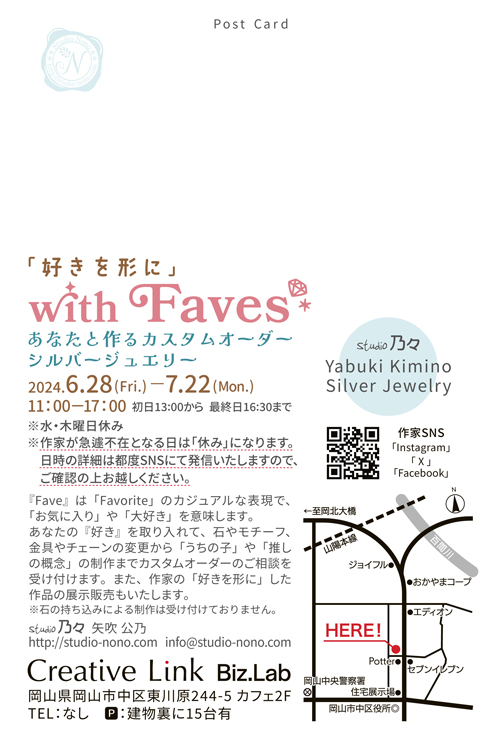 ■期間:2024/6/28(金)〜7/22(月) ■会場:Creative Link Biz.Lab ![]() 会場は岡山市中区役所北、けやき通り沿いに新しく建物から建ったカフェの2階「Creative Link Biz.Lab」にて。 お休み日は1Fのコーヒー店がOPENしていても展示はお休みです。 私のいない日=展示お休み日です。作品自体展示されていません。(奥に引っ込めていて何もないです。) |