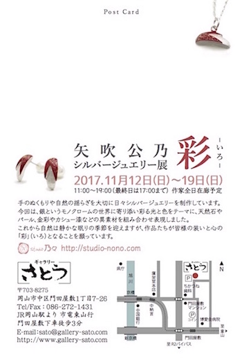 矢吹公乃 シルバージュエリー展、 ギャラリーさとうでは初の個展です。 今回はシルバーというモノクロームの世界に寄り添うように彩る光と色をテーマに、天然石やパールなどの色石のほか、金彩やカシュー漆などの異素材を使い、「色彩」「彩」=「いろ」を大切に制作しています。 これから秋から冬へと移りゆき、自然は静かな眠りにつく季節となりますが、その中でこれらの作品たちが皆様の装いと心の「彩」となることを願っています。 -------------------------------------------------- 矢吹公乃 シルバージュエリー展 彩 - いろ - ■期間:2018年11月12日(日)〜19(日) AM11:00〜PM7:00 最終日はPM5:00まで ※全日在廊しております。 ※作品販売します。 ■会場:ギャラリーさとう 岡山市中区門田屋敷1−7−26 tel:086-272-1431 JR岡山駅より市電東山行き門田屋敷下車徒歩3分 ![]() -------------------------------------------------- ・ピアスからイヤリング金具への変更ができます(+\1,080) ・色石の変更、チェーンの長さや紐等への変更もできますのでご相談ください。 |