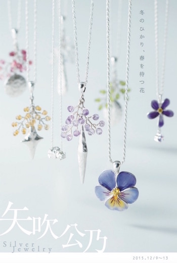 矢吹公乃 シルバージュエリー作品展、 カフェZで7回目の個展です。 今年のZの作品展は5日間限定!。 「冬の窓辺」テーマに、オーナメントのようなジュエリーや、 寒さの中でも色とりどりの花を咲かせる花壇のパンジーなどの 冬の新作や、1年を通じての新作定番作品がたくさん。 もちろん販売もいたします。 冬は贈り物の季節。大切な方へのプレゼント、 自分へのごほうびにいかがでしょうか。 -------------------------------------------------- 矢吹公乃 シルバージュエリー作品展 ■期間:2015年12月9日(水)〜13(日) AM11:00〜PM7:00 最終日はPM6:00まで 月・火曜日お休み ■会場:カフェ×アトリエZ →地図拡大 岡山市南区浜野2-1-35 tel:086-263-8988 駐車場や公共交通機関等の詳しい案内は こちらをご参考 ください。 ※全日在廊しております。 ※作品販売します。 -------------------------------------------------- ・ピアスからイヤリング金具への変更ができます(+\1,080) ・色石の変更、チェーンの長さや紐等への変更もできますのでご相談ください。 |