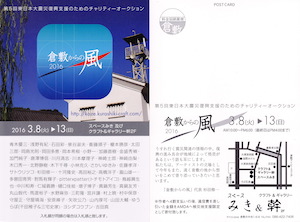 (日) 11:00~19:00 デザインフェスタ43 会場:東京ビッグサイト西ホール 入場料:前売1日¥800/両日¥1,500 当日1日¥1,000/両日¥1,800 ブースNo.:E-258 西1ホール1F (明るいエリアSブース両日) デザフェスこの度初参加です。Sブースで場所は狭目ではありますが、メインどころを中心に作品できるだけたくさん展示できればと思っています。ネット ショップに出ていない作品もたくさんありますし、この機会に直に作品を見に来ていただけたら嬉しいです。 ↓画像クリックで拡大 ![]() ●2016/3/8火)〜13(日) 倉敷からの風 2016 会場:スペースみき&ギャラリー幹 岡山県倉敷市中央1-6-8 時間:10:00~18:00(最終日は16:00まで) ※会期中休廊日無し 東日本大震災復興支援の為に立ち上げたチャリティオークション展「倉敷からの風」に昨年に引き続き今年も参加いたします。約60名の作家陣が出展する見応 えもたっぷりなシークレットオークション形式のイベントとなっております。逸品を見つけにぜひお越しください。 寄付金は作者へ4割支払いの後、通信費を差し引いた金額を「特定非営利活動法人アムダ(AMDA)」へ被災地支援限定として寄付いたします。 ↓画像クリックで拡大 ![]() ●2016/1/21(木)〜31(日) 作家がつむぐ物語り 〜The Gift Of…〜 会場:ギャラリー倉敷 倉敷市 中央1丁目8-11 時間:10:00~18:00(最終日は16:00まで) ※1/25(月)休廊 18人の作家が、がんばった自分へのご褒美、大切な人への贈り物にふさわしい作品を心を込めて作りました。 それぞれの作家がつむいだ物語りに耳を傾けながら、手にとってみてください。 ●2016/1/10(日) 10:30ー 15:00 arteVarie 14 (C.CITY 大阪104) インテックス大阪 3号館 C-32 Studio 乃々