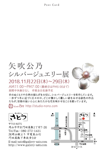 矢吹公乃 シルバージュエリー展、 昨年に引き続きギャラリーさとうで2回目個展です。 夏からあっという間に秋冬の作品展です。セーターやコートにも映える、うちにしたら少し大きめの作品達もお目見え。 皆様の装いと心にあたたかな花を咲かせます。 全日在廊予定です。 -------------------------------------------------- 矢吹公乃 シルバージュエリー展 ■期間:2018年11月22日(木)〜29日(木) AM11:00〜PM7:00 最終日はPM5:00まで ※全日在廊しております。 ※作品販売します。 ■会場:ギャラリーさとう 岡山市中区門田屋敷1−7−26 tel:086-272-1431 JR岡山駅より市電東山行き門田屋敷下車徒歩3分 ![]() -------------------------------------------------- ・色石の変更、チェーンの長さや紐等への変更もできますのでご相談ください。 |